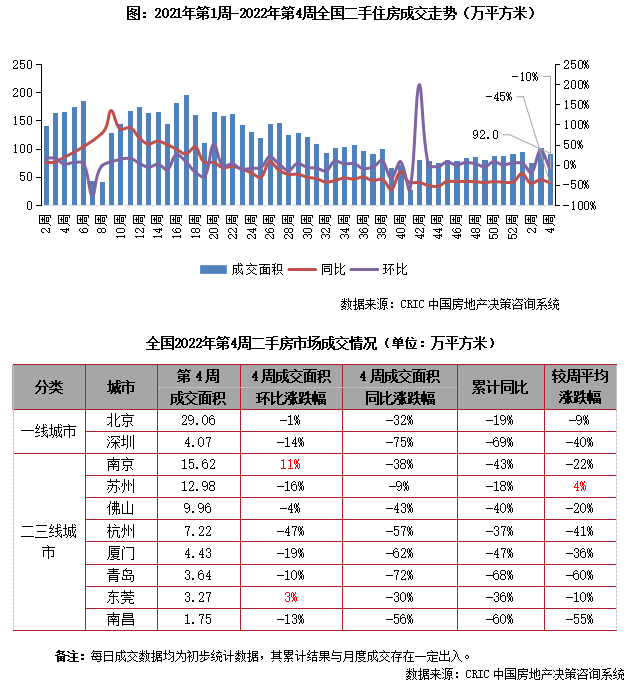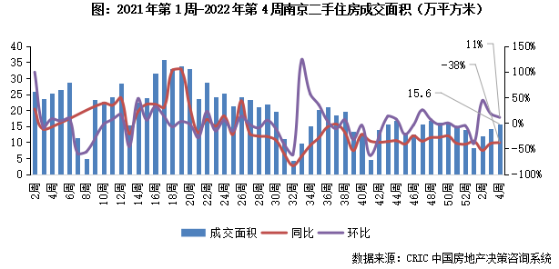 2022年第4周,南京二手住房成交面積收15.6萬平方米,環(huán)比較上周回升11%,同比跌幅收窄至38%。本周成交規(guī)模“三連漲”且同比跌幅持續(xù)收窄,預計后續(xù)市場或保持穩(wěn)中有增。