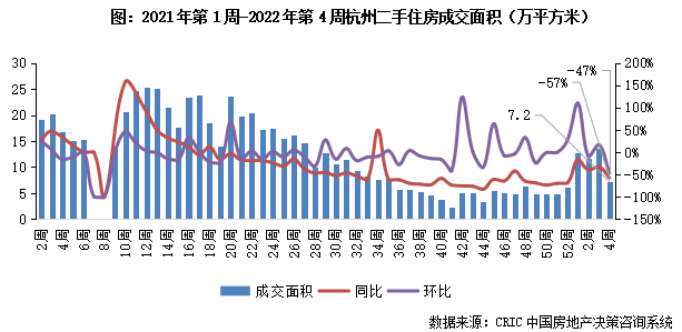 2022年第4周,杭州二手住房環(huán)比跌47%至7.2萬平方米,同比跌幅擴大至57%。2021年下半年以來杭州二手房市場持續(xù)下行后保持低位震蕩,前三周市場顯著放量回升但本周高位顯著回落,預計大幅震蕩后規(guī)模或企穩(wěn)。