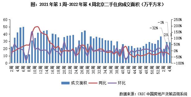 2022年第4周,北京二手房成交面積為29.1萬平方米,環(huán)比微跌1%持穩(wěn),較去年同期降幅擴大至32%。本周北京二手房市場成交較上周企穩(wěn),市場仍處于較高水平,預計短期內(nèi)市場規(guī)模或小幅震蕩。