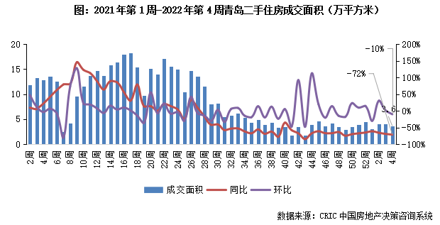 2022年第4周,青島二手住房成交面積環(huán)比下降10%、同比下降72%,成交規(guī)模3.6萬平方米。市場長期嚴控下消費者普遍購房信心不足,當前成交規(guī)模持續(xù)低位運行。