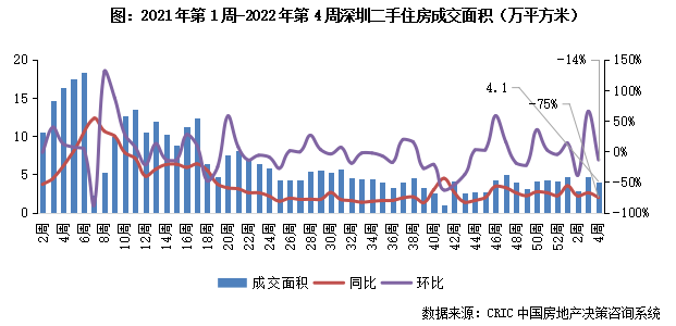 2022年第4周,深圳二手房成交4.1萬平方米,環(huán)比下降14%,同比降幅擴至75%。深圳二手房市場長期低位震蕩,受政策高壓當前市場觀望情緒仍然濃重,后市大概率延續(xù)走勢。