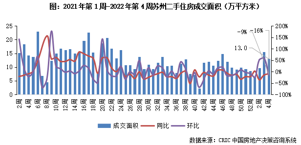 2022年第4周,蘇州二手住房成交面積環(huán)比降16%至13.0萬平方米,同比跌幅收窄至9%。本周市場成交量雖較上周回落但仍處高位,后續(xù)市場短期或高位企穩(wěn)。