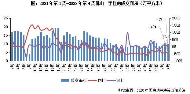 2022年第4周,佛山二手住房成交面積環(huán)比微跌4%、同比降幅43%,成交體量收10.0萬平方米。本周市場成交正常小幅回調,短期內(nèi)市場或在當前規(guī)模震蕩。