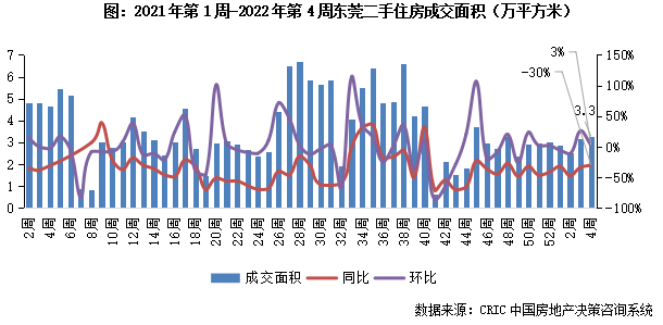 2022年第4周,東莞二手住房成交面積收3.3萬平方米,環(huán)比微增3%,同比跌幅收窄至30%。本周成交規(guī)模持續(xù)小幅回升,市場進入平臺波動期。