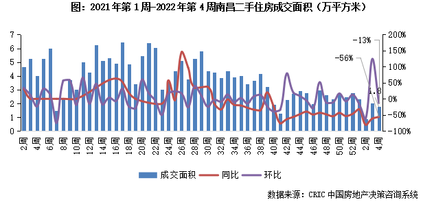 2022年第4周,南昌二手住房成交規(guī)模收1.8萬平方米,環(huán)比降13%,同比跌幅收窄至56%。“房地產(chǎn)稅”相關政策出臺致樓市再降溫,成交規(guī)模震蕩下行走勢浮現(xiàn)。