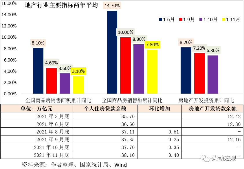 具體看,今年6-10月,房地產開發投資累計同比增速的兩年平均值分別為8.20%、8%、7.7%、7.2%和6.8%。今年6-11月,全國商品房銷售面積累計同比增速的兩年平均值分別為8.1%、10.25%、7.68%、4.60%、3.60%和3.10%,全國商品房銷售額同比增速的兩年平均值分別為14.70%、14.33%、10.82%、10%、8.8%和7.80%,顯然無論是地產開發投資,還是商品房銷售,均呈現出明顯下行態勢。