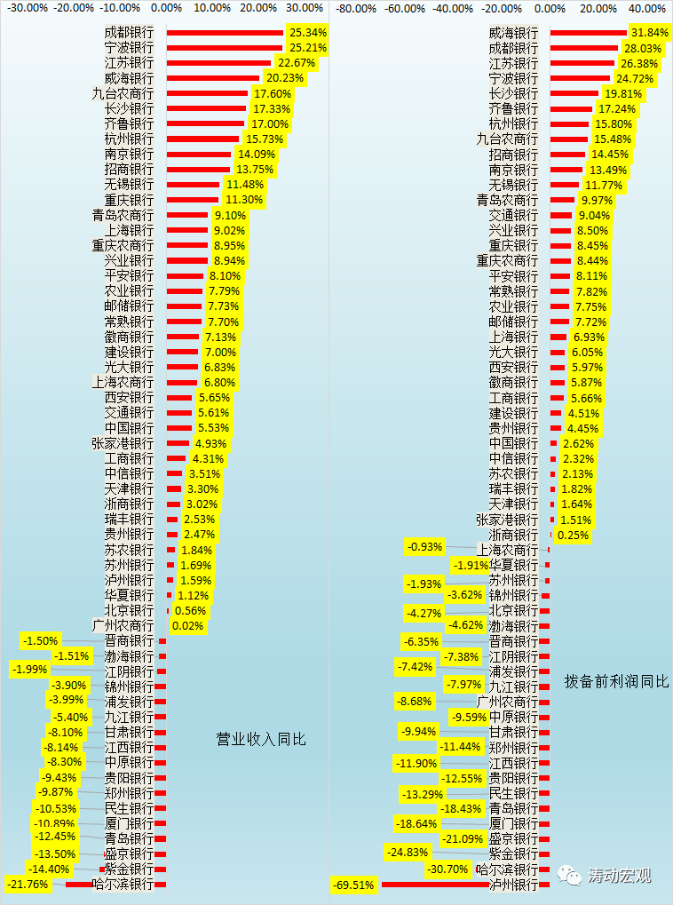 例如,瀘州銀行的凈利潤同比增速為25.53%,但其撥備前利潤同比卻大幅下降69.51%,諸如上海農商行、華夏銀行、青島銀行、晉商銀行、廈門銀行、北京銀行、九江銀行、渤海銀行、江西銀行、錦州銀行、中原銀行、甘肅銀行、貴陽銀行、浦發銀行、紫金銀行、鄭州銀行、廣州農商行等銀行同樣如此。