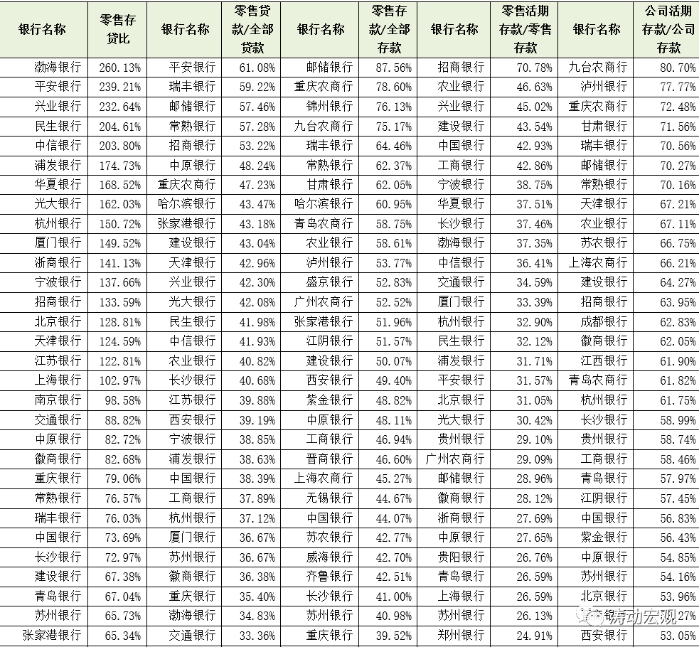 3、上市銀行零售存款占全部存款的比例平均為41.18%,國有大行與農商行最高(分別為51.02%和54.33%),股份行最低(僅為21.71%)。
