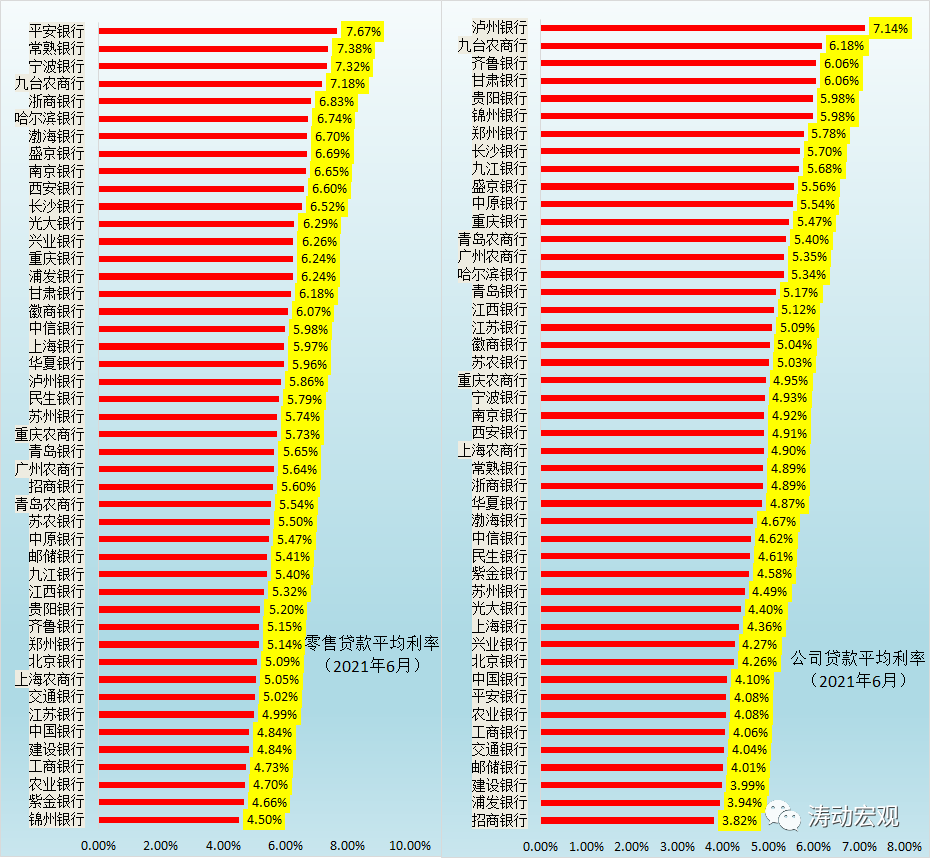 1、46家銀行的零售貸款利率平均為5.83%,其中有7家銀行低于5%、4家銀行高于7%。零售貸款利率較高的銀行主要有平安銀行(7.67%)、常熟銀行(7.38%)、寧波銀行(7.32%)與九臺農商行(7.18%)。