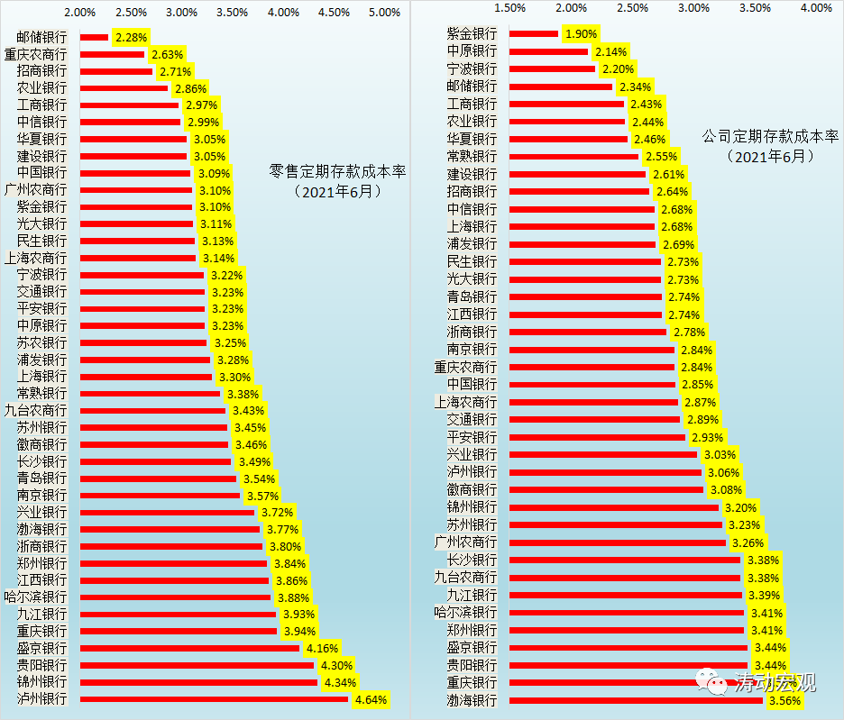 1、40家銀行的零售定期存款利率平均水平為3.41%,其中有9家銀行低于3.10%、14家銀行高于3.50%、4家銀行高于4%。零售定期存款利率較低的銀行主要有郵儲銀行、重慶農商行、招行、農行、工行、中信銀行、華夏銀行、建行與中行,零售定期存款利率較高的銀行主要有瀘州銀行、錦州銀行、貴陽銀行、盛京銀行、重慶銀行、九江銀行、哈爾濱銀行、江西銀行、鄭州銀行、浙商銀行、渤海銀行、興業銀行、南京銀行與青島銀行。