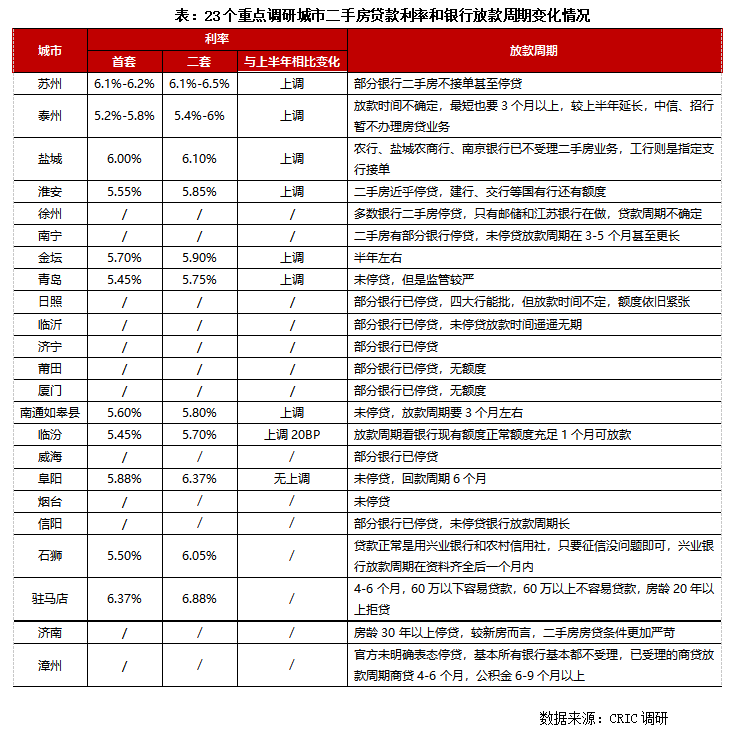 我們調研的23城中有6成以上銀行已經出現了二手房停貸現象或是放款時間遙遙無期。即便是尚未停貸城市,多數放款周期也在3-6個月,較上半年有不同程度的延長,同時銀行方面也加強了貸款監管,關于貸款額度,抵押房屋的房齡等都有明確要求,整體二手房的貸款難度還是要大于新房貸款的。