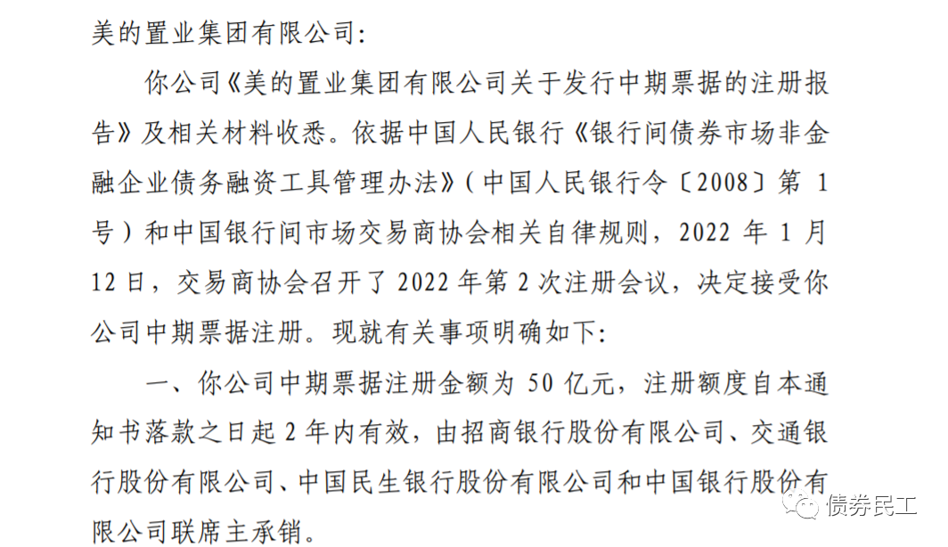 2、美的置業集團有限公司取得50億元中期票據批文。美的置業中期票據批文的公布日期是2022年3月4日,注冊會議的時間為2022年1月12日(第2次注冊會議),落款日為1月13日。