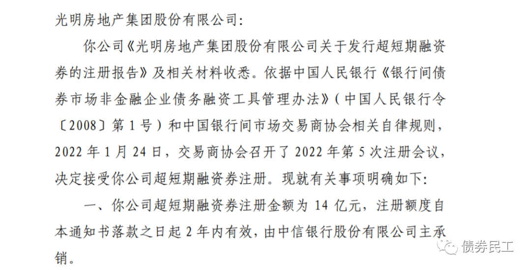 4、光明房地產集團股份有限公司取得14億元超短期融資券批文。光明地產集團超短期融資券批文的公布日期是2022年3月4日,注冊會議的時間為2022年1月24日(第5次注冊會議),落款日為1月28日。