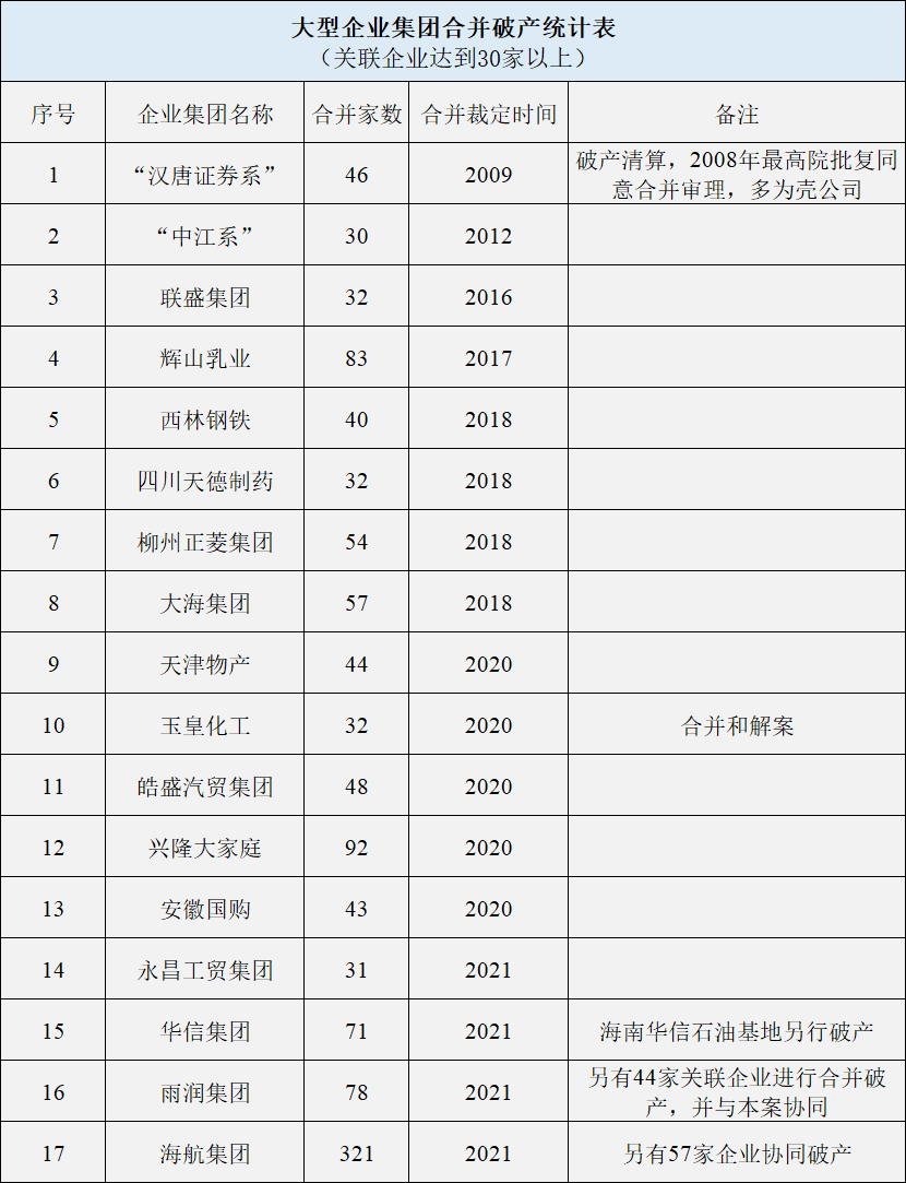 自2006年修訂的《企業破產法》實施以來,如何對大型企業集團進行破產一直是破產從業人員所面臨的挑戰。自2009年廣東中谷糖業集團有限公司及其下屬公司破產重整案、浙江縱橫集團“1+5”合并破產重整案以來,實質合并破產模式成型。近來年實質合并破產已經成為關聯企業破產的標準操作,且涉及企業數量越來越多,規模越來越大,為拯救大型企業集團作出重大貢獻。