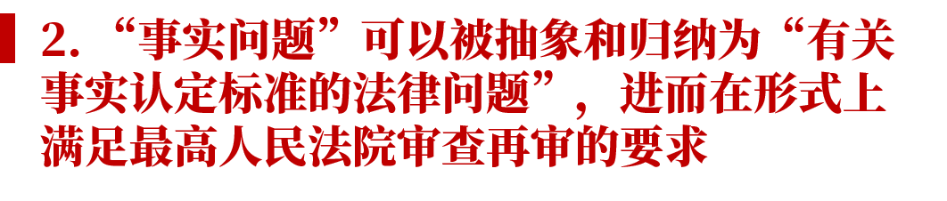 當(dāng)然,我們現(xiàn)在無從得知最高人民法院未來審查案件的實際標(biāo)準(zhǔn),以及其對待此類“有關(guān)事實認(rèn)定標(biāo)準(zhǔn)的法律問題”的態(tài)度。這樣的再審申請策略是否能夠成功,還有待進一步觀察。