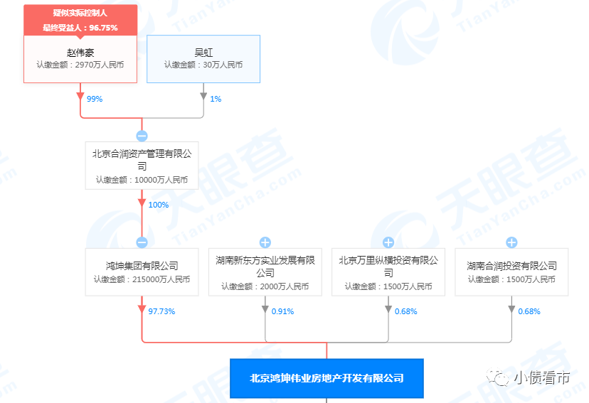 從股權結構上來看,鴻坤地產的控股股東為鴻坤集團,持股比例為97.73%,穿透后實控人為自然人趙偉豪。
