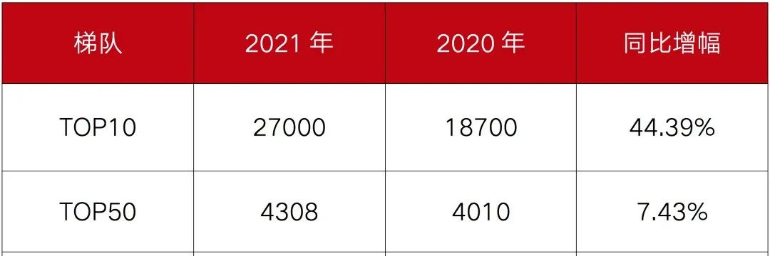 與2020年相比,TOP10門檻提升8300萬方,增幅為44.39%;TOP50門檻提升298萬方,增幅達7.43%。較2020年,TOP10的門檻增幅最大,頭部企業的提升度進一步加速。