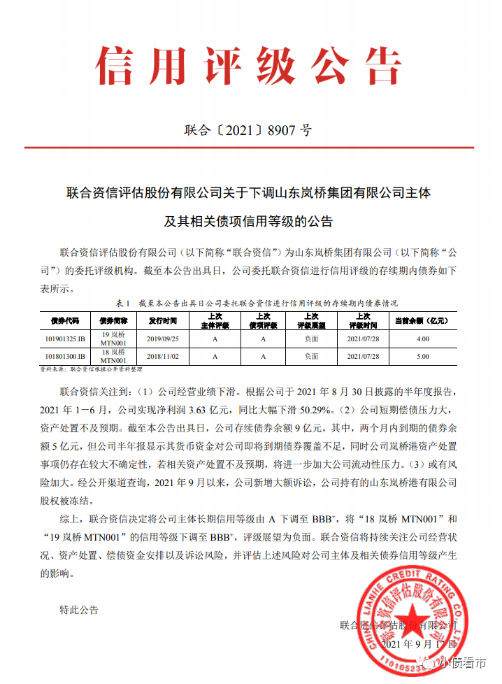 9月17日,聯合資信公告稱,決定將山東嵐橋集團有限公司(以下簡稱“嵐橋集團”)主體和“18嵐橋MTN001”、“19嵐橋MTN001”信用等級由A下調至BBB+,評級展望為負面。