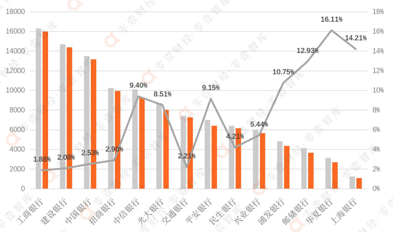 1、文中將圖表分拆為兩部分,主要考慮到層級相差較大,若在同一圖表排序則無法對排名偏后的銀行做直觀對比。