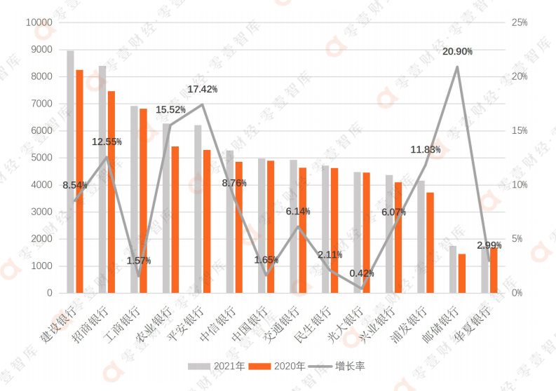 同樣對信用卡貸款余額規模較大的銀行(信用卡貸款余額達到千億元,即前14名)單獨進行對比,與累計發卡量這一指標的樣本不同的是上海銀行則被剔除在外,而農業銀行由于未披露累計發卡量但披露了信用卡貸款余額進入了對比樣本內。14家銀行全部為增長趨勢,除了郵儲銀行達到20.9%的增長外,平安銀行、農業銀行、招商銀行、浦發銀行增長率均超過了10%。另一方面,對比2020年的貸款余額數據情況,郵儲銀行和中信銀行憑借著較高的增長率分別在2021年信用卡貸款余額趕超了華夏銀行和中國銀行。