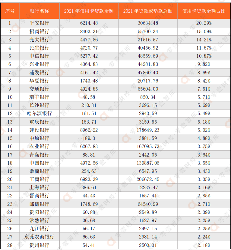 1、表格中各銀行根據信用卡貸款余額占比進行降序排列。