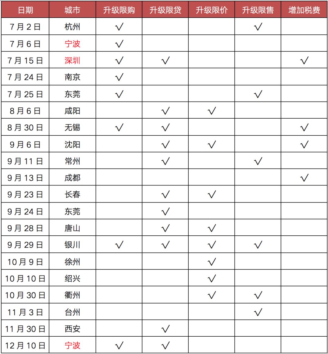 下半年伴隨著市場過熱,限價盤頻現“萬人搖”,土地市場高單價、高溢價地塊頻出、甚至“面粉貴過面包”的情況在部分二三線城市再次出現,極大挑戰“穩地價、穩房價、穩預期”的調控目標。杭州、沈陽、西安和寧波等19城政策加碼,主要涉及升級限購、升級限貸、升級限價、升級限售以及增加房地產交易稅費等內容,其中深圳政策力度最嚴苛,寧波更是兩度政策加碼。