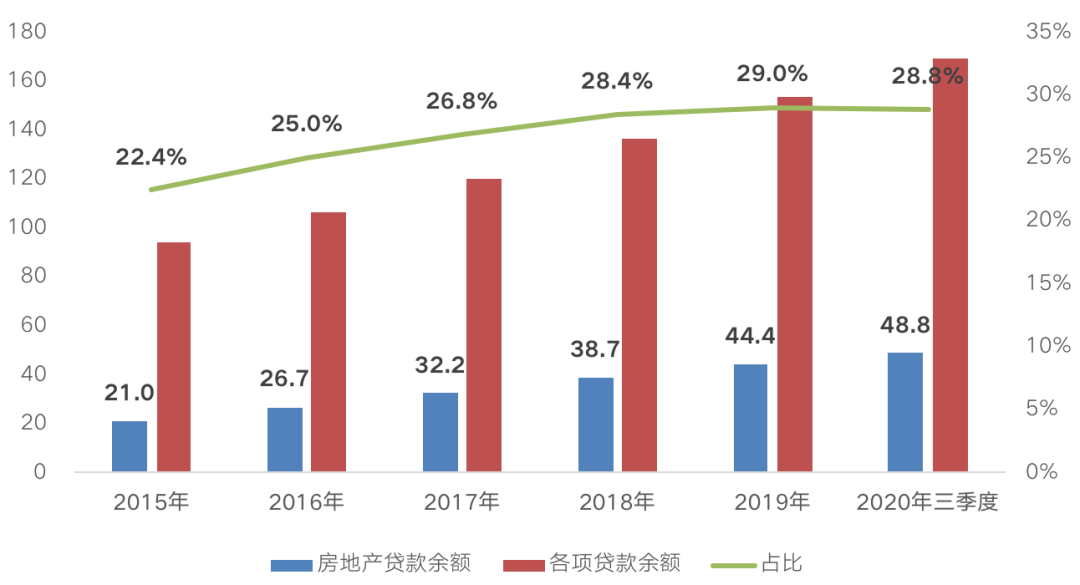 截至2020年三季度,全國房地產貸款余額高達48.8萬億元,較2015年凈增長132%,占各項貸款余額的比重多達28.8%,較2015年提升6.4個百分點。說明在實體經濟投資回報率低、風險高企的大環境下,房地產行業“吸金”效應依舊不減。
