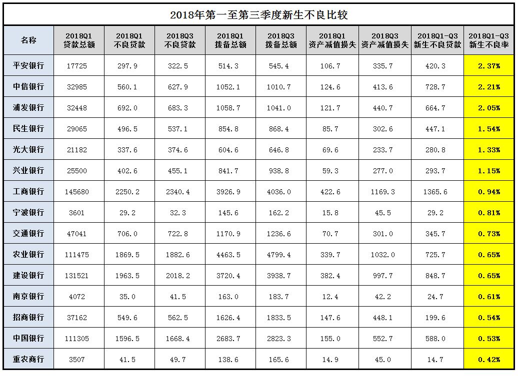 4、關(guān)于2018Q1至Q3新生不良率排名。這個排名才是最重要的,當然也并不是說排名最高的就有問題,因為每家銀行的文化不一樣,有的激進一點,利率高不良也相對高一些,只要風險和機遇能匹配就好,我們這個地方就沒有考慮這些,只是比較新生不良率的情況,也就是信用成本。一般情況下,銀行的損失的信用成本在2%左右就算及格,對應到我們的新生不良率,一年下來控制在4%以內(nèi)就算及格,如果能在2%以內(nèi)就是資產(chǎn)質(zhì)量表現(xiàn)優(yōu)異。總體來看,2018年第二和第三季度行業(yè)的新生不良率并不算高,新生不良率最低的三家銀行是重慶農(nóng)村商業(yè)銀行,中國銀行和招商銀行,新生不良率最高的是平安銀行、中信銀行和浦發(fā)銀行。具體排序如下: