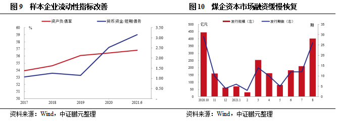 2021年6月末,樣本企業平均資產負債率為56.81%,明顯低于行業平均水平(66.14%),較2020年末變動不大,樣本企業資本結構仍未得到有效改善。2021年6月末,樣本企業貨幣資金/短期債務為3.15,較上年末水平上升0.62,樣本企業流動性指標繼續邊際改善。此外,2021年8月煤企債券市場共發行26期債券,融資規模超過400億元,已接近去年10月份的發行規模,行業融資逐漸回暖。預計隨著煤價繼續維持高位,樣本企業盈利將持續維持較高水平,經營活動現金流持續凈流入,償債壓力邊際改善。