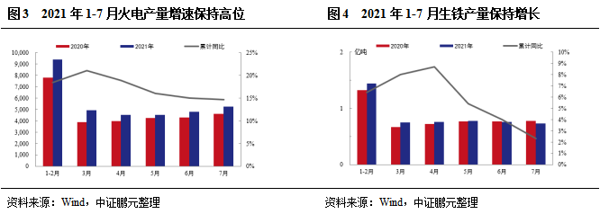 鋼鐵方面,2021年1-7月,我國生鐵產量為5.34億噸,同比增長2.30%。建材方面,2021年1-7月全國水泥產量13.53億噸,同比增長10.40%。