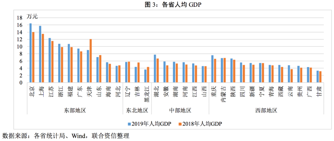 2020年各省份GDP規(guī)模變動(dòng)不大,且人口流動(dòng)短期內(nèi)并不會(huì)有趨勢(shì)性的變化,因此我們采用2019年的人均GDP進(jìn)行觀察。從2019年人均GDP規(guī)模看,東部地區(qū)領(lǐng)跑全國,除了東部地區(qū)以外,其他地區(qū)沒有明顯分化。大部分省份人均GDP隨著經(jīng)濟(jì)規(guī)模的擴(kuò)大而進(jìn)一步提升,值得注意的是東三省以及天津、山東,2019年人均GDP較2018年反而下降,尤其是天津下降顯著,主要是因?yàn)樘旖蚣皷|三省的產(chǎn)業(yè)結(jié)構(gòu)均以石油化工、鋼鐵等傳統(tǒng)工業(yè)為主,而近些年隨著我國經(jīng)濟(jì)的轉(zhuǎn)型,傳統(tǒng)經(jīng)濟(jì)增長(zhǎng)動(dòng)力放緩,造成經(jīng)濟(jì)增長(zhǎng)放緩、人均GDP下降。