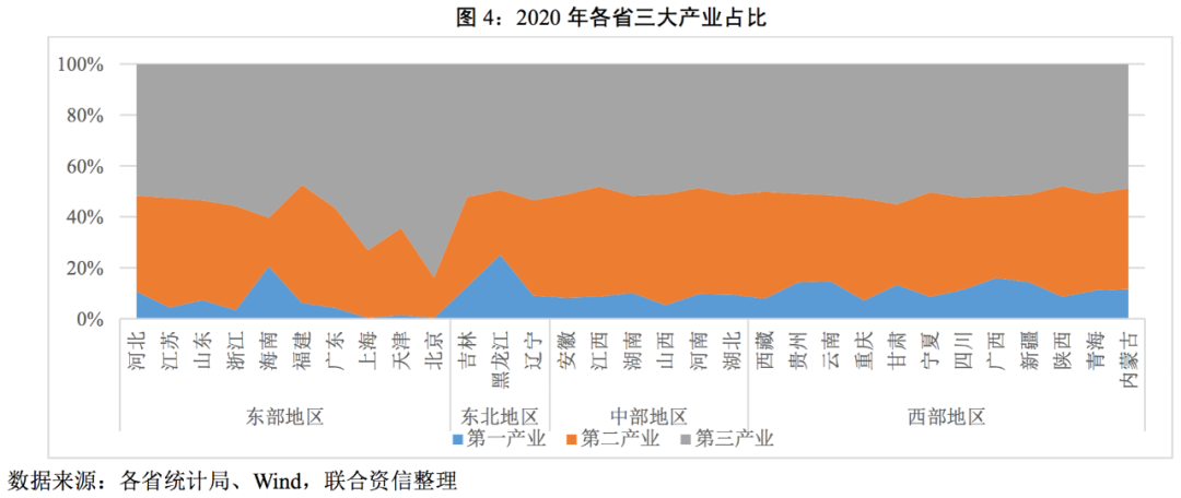 從三大產(chǎn)業(yè)規(guī)模占比看,第三產(chǎn)業(yè)是各省第一大產(chǎn)業(yè),與2019年相比幾乎沒有變化,與我國的經(jīng)濟(jì)產(chǎn)業(yè)構(gòu)成相一致。具體看,作為全國政治中心的北京以及內(nèi)陸金融中心的上海第三產(chǎn)業(yè)發(fā)展顯著優(yōu)于其他省份;海南和黑龍江的第一產(chǎn)業(yè)占比明顯高于全國其他地區(qū)。分區(qū)域看,東部地區(qū)和東北地區(qū)產(chǎn)業(yè)構(gòu)成差異更為明顯,而中部及西部地區(qū)產(chǎn)業(yè)構(gòu)成差異不大。
