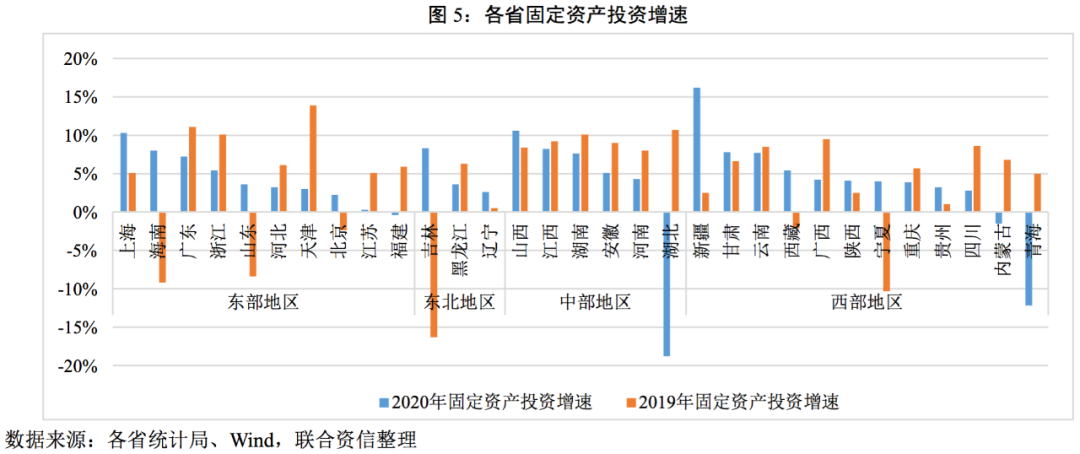 2020年各省份的固定投資增速較2019年有較大的變化,其中有13個(gè)省份固定資產(chǎn)投資增速超過2019年,18個(gè)省份不及2019年。除福建、內(nèi)蒙古、青海以及湖北以外,其余27個(gè)省份固定資產(chǎn)投資增速均實(shí)現(xiàn)正增長(zhǎng)。中部地區(qū)固定資產(chǎn)投資增速整體相對(duì)較高,除湖北以外均超過4%(全國固定資產(chǎn)投資增速為2.90%);西部地區(qū)分化較為明顯。