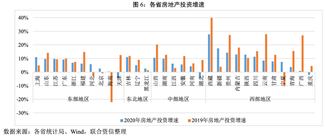 房地產(chǎn)投資方面,2020年31個(gè)省份中除重慶、天津以及湖北以外,其余28個(gè)省份房地產(chǎn)投資均為正增長(zhǎng);有15個(gè)省份房地產(chǎn)增速高于全國增速(7%),且有9個(gè)省份的增速已經(jīng)超過2019年同期水平。分區(qū)域看,西部地區(qū)房地產(chǎn)投資增速整體高于其他省份。進(jìn)一步比較固定資產(chǎn)投資增速與房地產(chǎn)投資增速發(fā)現(xiàn),僅江西、黑龍江、廣西、海南、重慶以及天津的固定投資增速大于房地產(chǎn)投資增速,大部分省份的固定投資增速依賴于房地產(chǎn)投資支撐,與全國投資結(jié)構(gòu)相同。