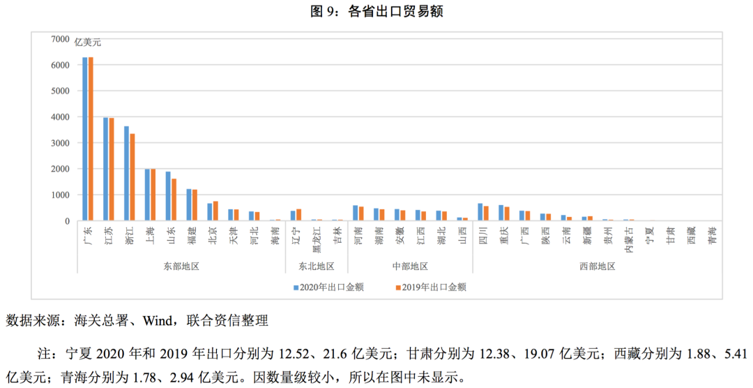 外貿(mào)方面,區(qū)域出口集中度較高。2020年,東部地區(qū)沿海城市廣東、江蘇、浙江、上海、山東以及福建出口貿(mào)易額(按美元計(jì)價(jià))占全部出口貿(mào)易額的73.24%,上述六省出口額較2019年增長(zhǎng)3.17%(全國增長(zhǎng)3.60%);而全年出口額不足百億的省份全部集中在西部和東北地區(qū)。與2019年相比,有12個(gè)省份出口金額出現(xiàn)下降,19個(gè)省份出口金額上升。分區(qū)域看,2020年東部、西部、中部以及東北地區(qū)出口占我國總出口比重分別為79.11%、9.53%、9.52%和1.84%,與2019年相比,中部、東部和東北地區(qū)出口比重均有下降,其中中部地區(qū)出口比重下降5.33個(gè)百分點(diǎn),下降較為明顯,西部地區(qū)出口比重略有上升。在我國的出口中,出口額較大的產(chǎn)品有機(jī)電設(shè)備、紡織品、家具玩具和車輛及零部件等,與上述東部沿海六省的產(chǎn)業(yè)結(jié)構(gòu)相對(duì)應(yīng),同時(shí)沿海的地理位置也為其出口提供了很大便利。