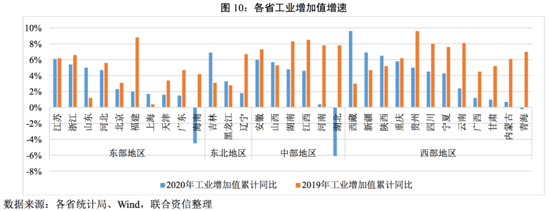?工業(yè)生產(chǎn)方面,僅青海、海南以及湖北三個(gè)省份的工業(yè)增加值增速尚未轉(zhuǎn)正;東部地區(qū)工業(yè)企業(yè)利潤(rùn)遙遙領(lǐng)先,中部和西部地區(qū)次之,東北地區(qū)明顯落后;區(qū)域內(nèi)分化程度進(jìn)一步加劇。