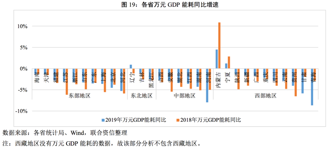 分區(qū)域看,2019年大部分省份的GDP能耗同比均有所下降,而內(nèi)蒙古和寧夏連續(xù)兩年均為正增長(zhǎng),且內(nèi)蒙古的增速高達(dá)4.49%,遼寧則由2018年的能耗下降轉(zhuǎn)為2019年的增長(zhǎng)。習(xí)近平總書記在十九屆五中全會(huì)、中央經(jīng)濟(jì)工作會(huì)議、中央全面深化改革委員會(huì)會(huì)議等重要會(huì)議多次強(qiáng)調(diào)了抓緊制定碳排放達(dá)峰與碳中和行動(dòng)方案,2020年《政府工作報(bào)告》規(guī)劃了“十四五”期間我國的能源消耗和碳排放工作。上述政策將會(huì)對(duì)以鋼鐵和石油化工等傳統(tǒng)工業(yè)為主的省份,如東三省、河北以及天津等,帶來較大的產(chǎn)業(yè)轉(zhuǎn)型壓力,同時(shí)對(duì)經(jīng)濟(jì)增長(zhǎng)帶來一定的壓力。