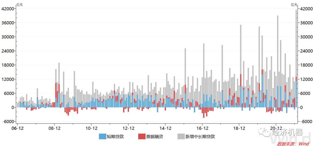 1)新增人民幣貸款好于預期,結構整體一般。1月新增3.98萬億人民幣貸款,較預期高2200億元,同比多增4000億元,相對強勢。從分項看,票據融資新增1788億元,同比多增3193億元;短期貸款新增1.11萬億元,同比多增2037億元(圖1),是總量多增的主要原因;中長期貸款新增2.84萬億元,同比少增1424億元,是最大的拖累因素。票據融資的大幅多體現了央行在信用擴張供給端的努力,而中長期貸款少增則反映實體需求的疲弱。