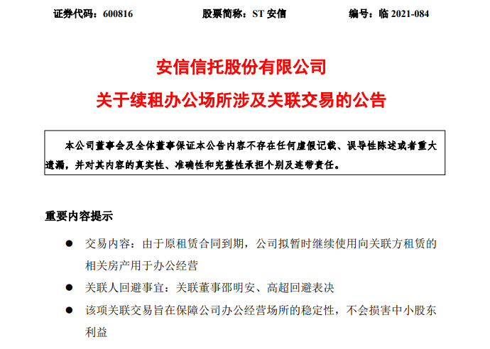 除此以外,一份涉及到關于安信信托續租辦公場所涉及關聯交易的公告,卻意外透露了一些信號。