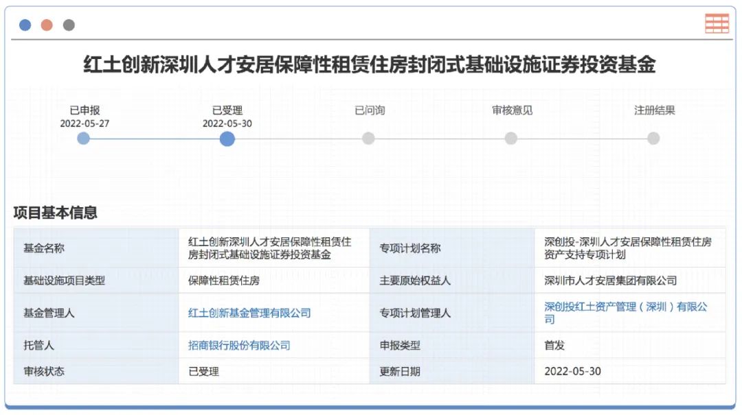 同日,中金廈門安居保障性租賃住房、紅土創新深圳人才安居保障性租賃住房兩只REITs分別于上交所、深交所和證監會報送申請材料,成為首批上報的兩單保障性租賃住房REITs。
