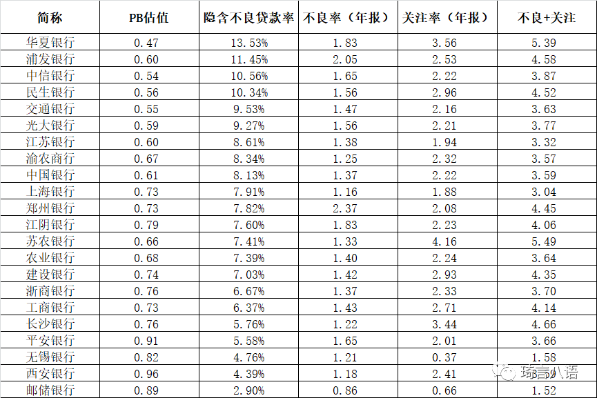 因此,可以參照當(dāng)前的估值水平,根據(jù):銀行隱含不良率=【銀行貸款減值準(zhǔn)備+(1-當(dāng)前PB)*凈資產(chǎn))】/貸款余額,逆推出市場認(rèn)為的隱含不良率,目的是可以在一定程度上考量銀行的真實(shí)不良率水平。