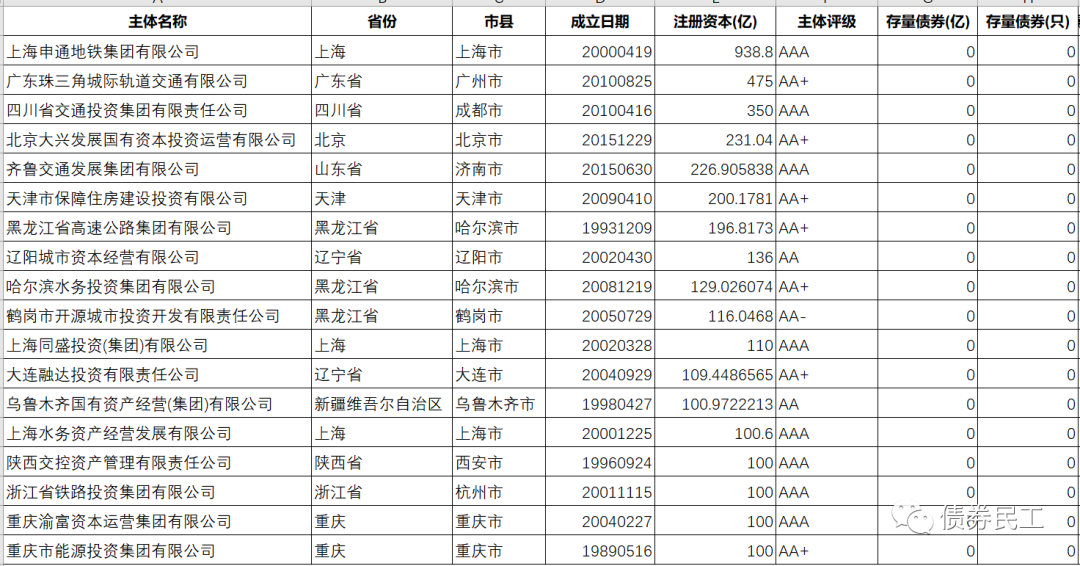 而在這些存量債券金額為零的城投公司發行人中,注冊資本超過100億元的有18家,其中注冊資本和實收資本最高的是上海申通地鐵集團有限公司,達到了938.80億元。