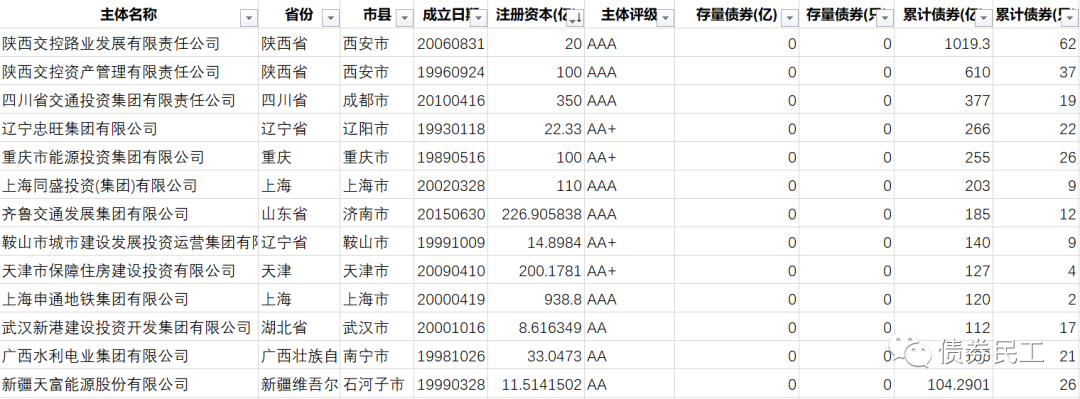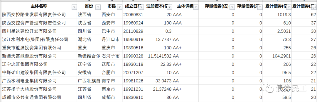 存量債券金額為零的城投公司