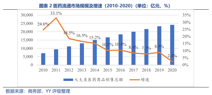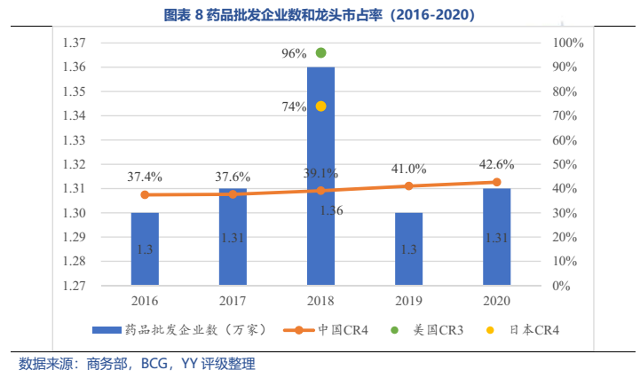 本文從產業鏈、行業規模及增速、相關政策、競爭格局等角度對醫藥流通行業基本面進行了梳理,主要觀點如下:1)醫藥流通企業整體議價能力較弱;2)醫藥批發行業“4+N”競爭格局基本形成,前四大(國藥控股、上海醫藥、華潤醫藥、九州通)市占率43%,仍有提升空間;3)醫藥零售行業增速高于行業整體,行業地位靠前的企業有國大藥房、大參林、老百姓、益豐藥房、一心堂、同仁堂等,集中度仍處于較低水平,且連鎖藥店跨區域擴張難題影響集中度提升。