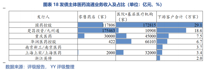 3)下游客戶數量上,國藥控股和九州通(楚昌投資)分別達29.1萬家和18.6萬家;結構上,大多主體以醫院等醫療機構為主。