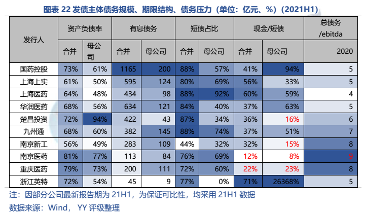 4)南京醫藥、南京新工本部、楚昌投資本部有一定短債壓力,現金/短債在25%以下;長期償債能力上,九州通、南京醫藥、南京新工和浙江英特較弱,總債務/ebitda在9倍以上。