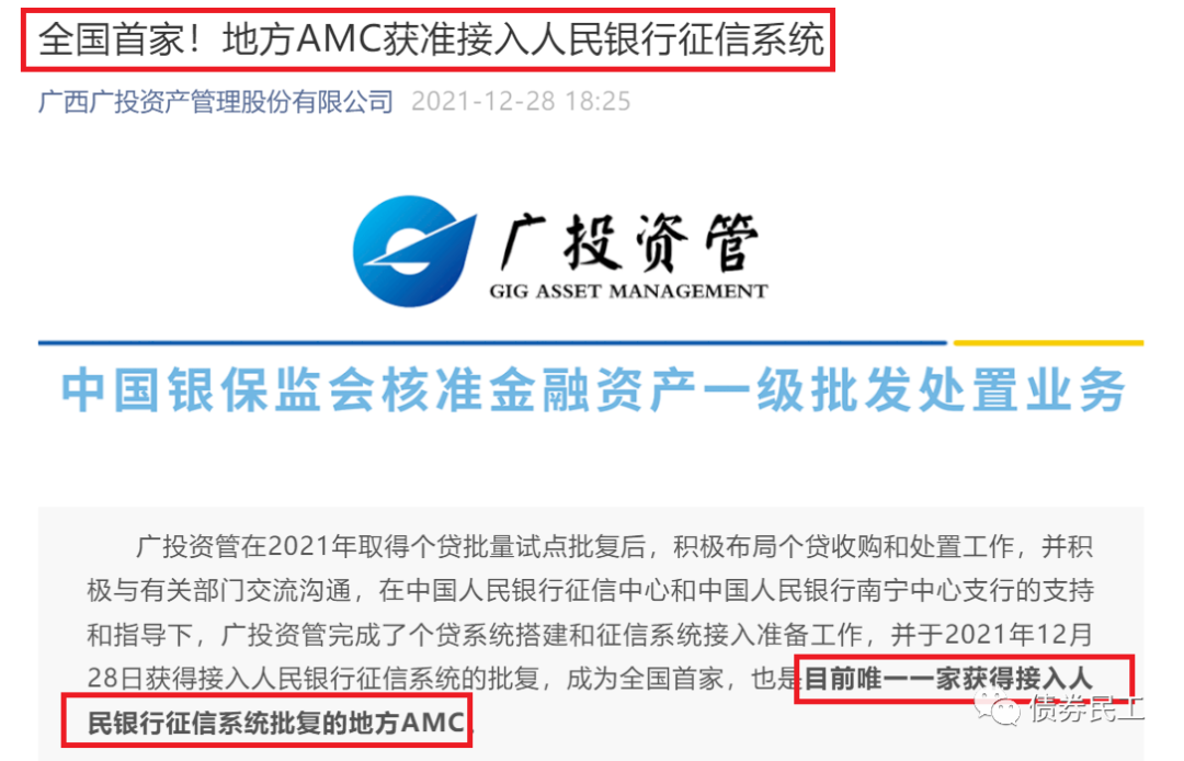 2、廣西廣投資產管理股份有限公司公眾號2021年12月28日公布公司正式獲準接入人民銀行征信系統,成為目前全國唯一一家接入人民銀行征信系統的地方資產管理公司。在此之前,地方資產管理公司是無法直接接入征信系統的。廣西資產此次成功接入人民銀行征信系統,意味著從政策上來說不存在障礙了。行業內的其他地方資產管理公司,都可以申請加入人民銀行征信系統。如果地方AMC均申請接入了人民銀行征信系統,那對于對于融資人的威懾力有了很大的提升,對于融資人的約束力也大大加強。