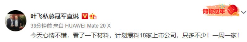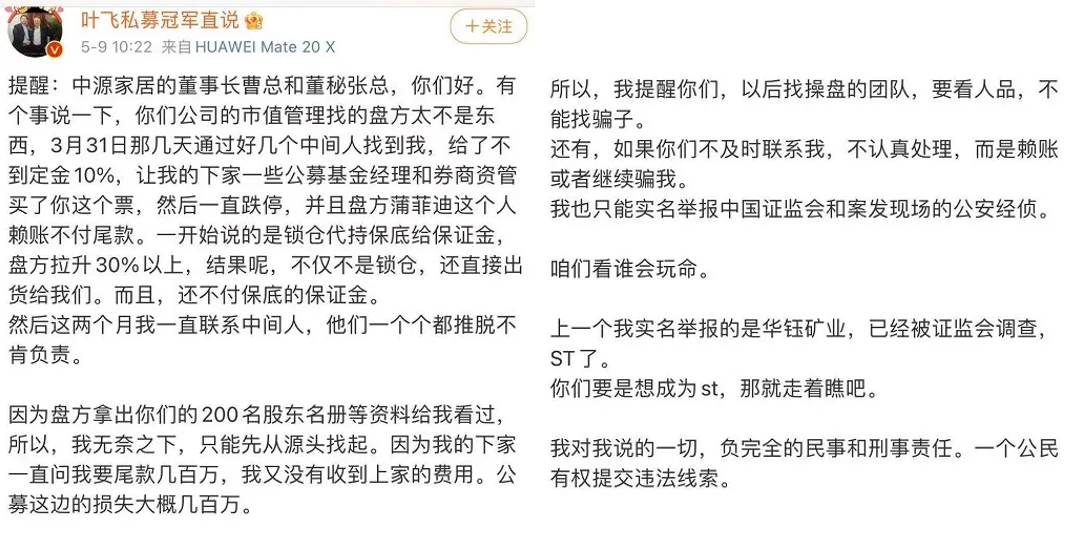 其實早在一個月前,葉飛在微博中就曾表示:“下一個我要實名舉報中源家居,提前給大家預告一下。” 這是葉飛首次公開提到中源家居(603709.SH),并稱會舉報更多欺騙他、讓他損失過的上市公司。