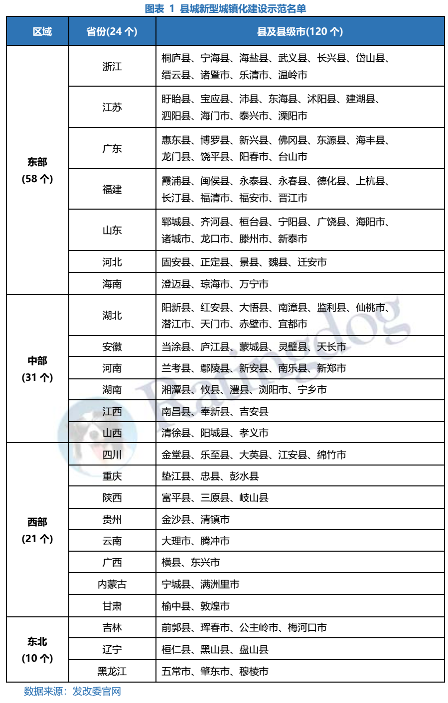 東部經(jīng)濟(jì)發(fā)達(dá)地區(qū)縣城入選數(shù)量多于西部、東北經(jīng)濟(jì)欠發(fā)達(dá)地區(qū)。120個(gè)示范縣中,東部省份占據(jù)58個(gè),數(shù)量將近一半,其中經(jīng)濟(jì)較為發(fā)達(dá)的省份浙江、江蘇、廣東、福建、山東均為10個(gè);中部次之,共有31個(gè)縣城入選示范縣,其中湖北為10個(gè),遠(yuǎn)多于其他中部省份,可能發(fā)改委考慮到湖北在中部省份中經(jīng)濟(jì)較為發(fā)達(dá),且2020年受到疫情影響較為嚴(yán)重,給與一定的政策支持;西部和東北經(jīng)濟(jì)較為落后,入選縣城數(shù)量較中、東部有所減少。