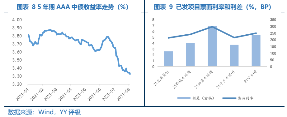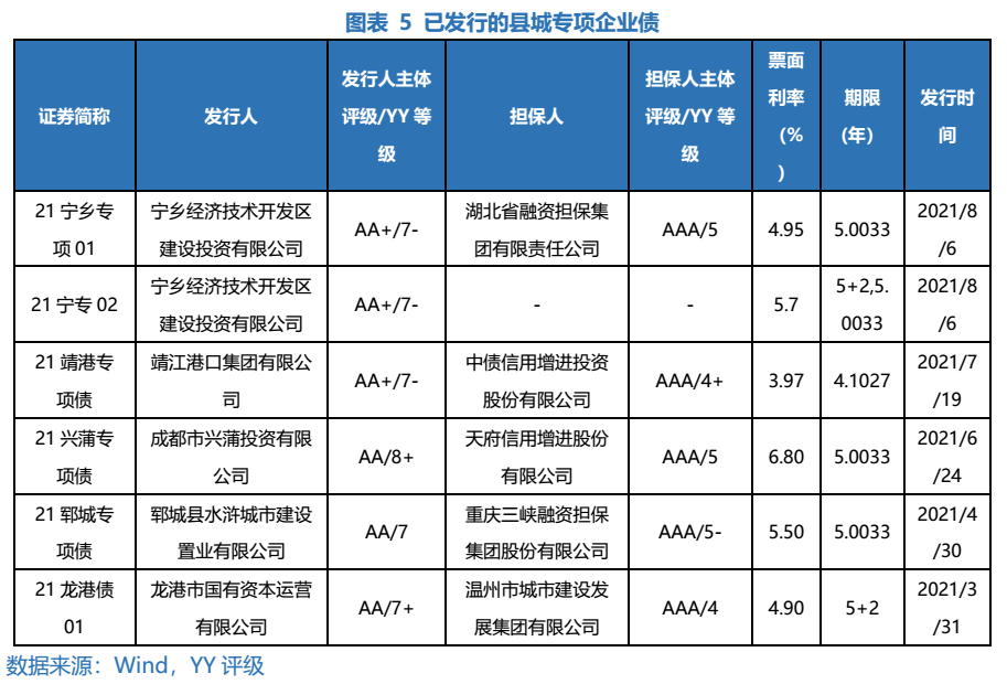 目前已發(fā)行項(xiàng)目數(shù)量較少,多數(shù)項(xiàng)目由擔(dān)保公司進(jìn)行擔(dān)保,使得債項(xiàng)評(píng)級(jí)達(dá)到AAA。截止至2021年8月15日,已有5家城投平臺(tái)發(fā)行6只縣城專項(xiàng)企業(yè)債,其中寧鄉(xiāng)經(jīng)濟(jì)技術(shù)開發(fā)區(qū)建設(shè)投資有限公司發(fā)行的是雙品種企業(yè)債,整體發(fā)行單數(shù)偏少。除了“21寧專02”無擔(dān)保外,其余5只債券均加了擔(dān)保使得債項(xiàng)評(píng)級(jí)達(dá)到AAA。此次發(fā)行指引的其中一個(gè)實(shí)質(zhì)性利好就是“支持縣城特別是縣城新型城鎮(zhèn)化建設(shè)示范地區(qū)內(nèi)主體信用評(píng)級(jí)優(yōu)良的企業(yè),以自身信用發(fā)行本專項(xiàng)企業(yè)債券”。在此之前,對(duì)于非省會(huì)城市的AA縣平臺(tái),發(fā)改委一般要求有擔(dān)保措施,這一條對(duì)發(fā)行條件有所放松。多數(shù)債券還是選擇加擔(dān)保進(jìn)行發(fā)行,可能因?yàn)檫@些平臺(tái)資質(zhì)稍弱,若不加擔(dān)保,投資者認(rèn)可度較差,發(fā)行難度有所增加。再進(jìn)一步細(xì)看,5只債券中有4只選擇了不同的4家融資擔(dān)保公司進(jìn)行擔(dān)保,另外1只債券“21龍港債01”由溫州市級(jí)主要平臺(tái)溫州市城市建設(shè)發(fā)展集團(tuán)有限公司進(jìn)行擔(dān)保。相比于由市場(chǎng)化的擔(dān)保公司對(duì)債券進(jìn)行擔(dān)保,由其他層級(jí)更高的平臺(tái)進(jìn)行擔(dān)保,減少擔(dān)保費(fèi)用的支出,同時(shí)體現(xiàn)了區(qū)域內(nèi)的城投資源協(xié)調(diào)。2021年8月5日寧鄉(xiāng)經(jīng)濟(jì)技術(shù)開發(fā)區(qū)建設(shè)投資有限公司發(fā)行的“21寧專02”(品種一)為首只未加擔(dān)保的縣城專項(xiàng)企業(yè)債,最終發(fā)行利率為5.70%,較由湖北省融資擔(dān)保集團(tuán)擔(dān)保的“21寧專02”(品種二)的發(fā)行利率4.95%,高出75BP。